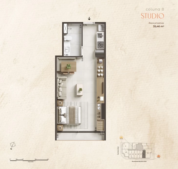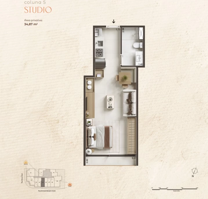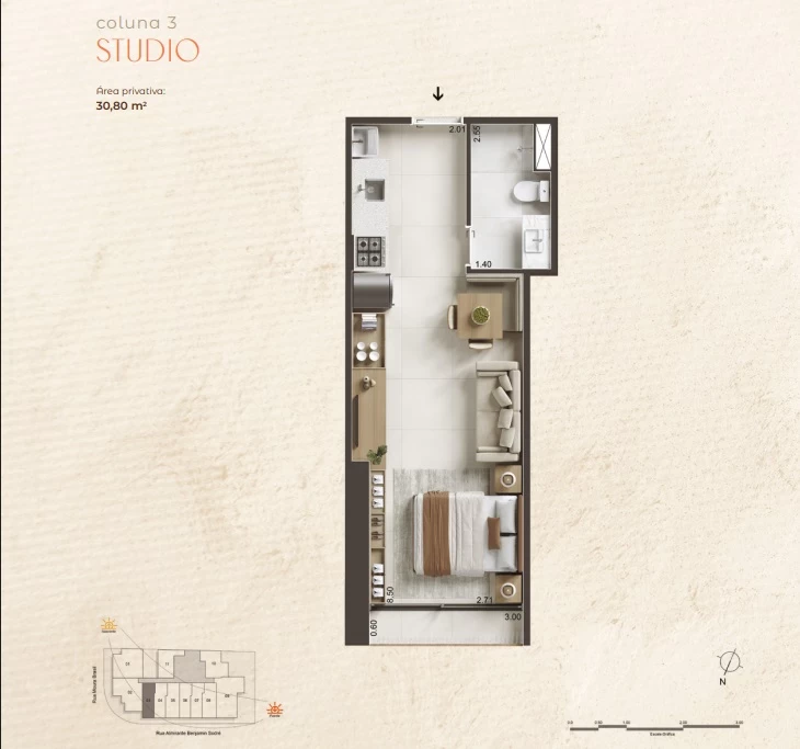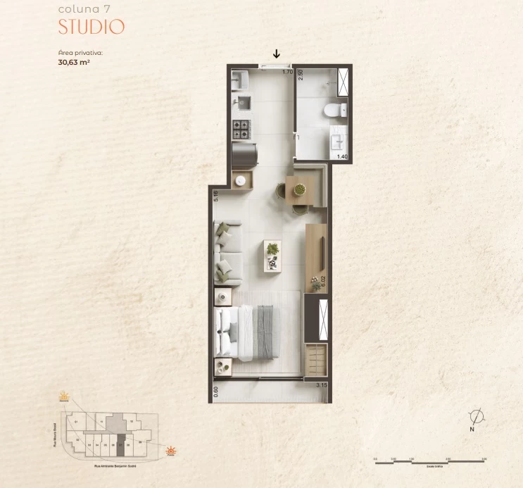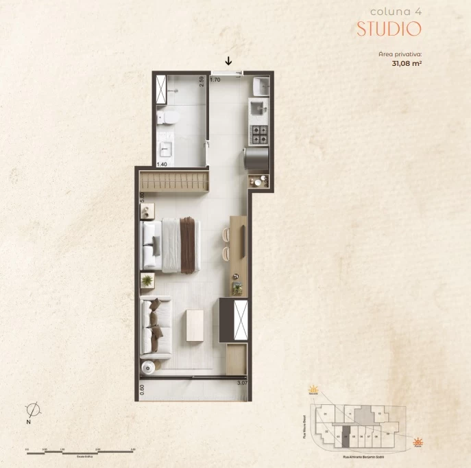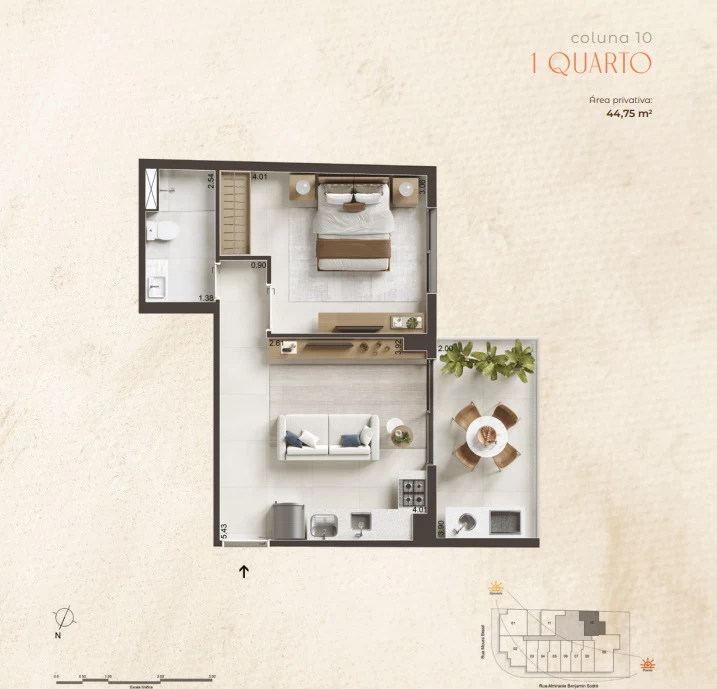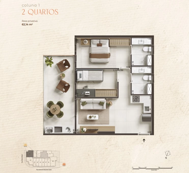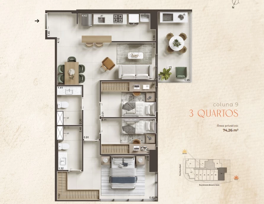 Unidades de 3 quartos, com 1 suíte com 74m².